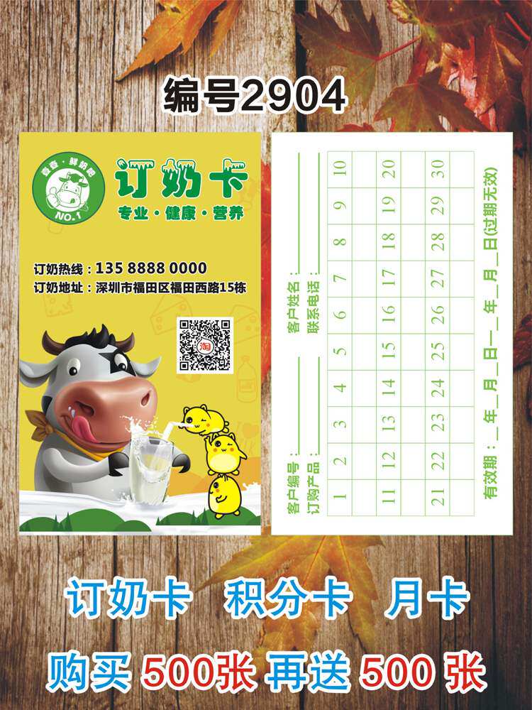 赠送积分月卡新鲜牛奶羊奶集章名片制作设计高档纸印刷订奶卡次。热门设计联盟服务商