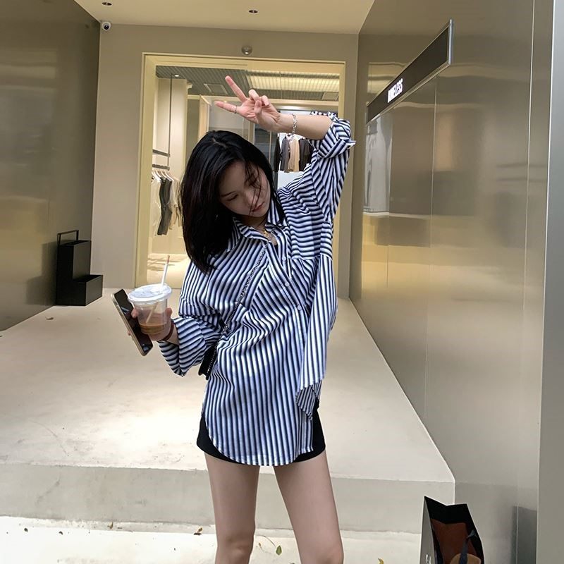 周禧儿早秋上衣设计感小众女宽松显瘦初秋条纹小个子衬衫长袖港味热门设计联盟服务商