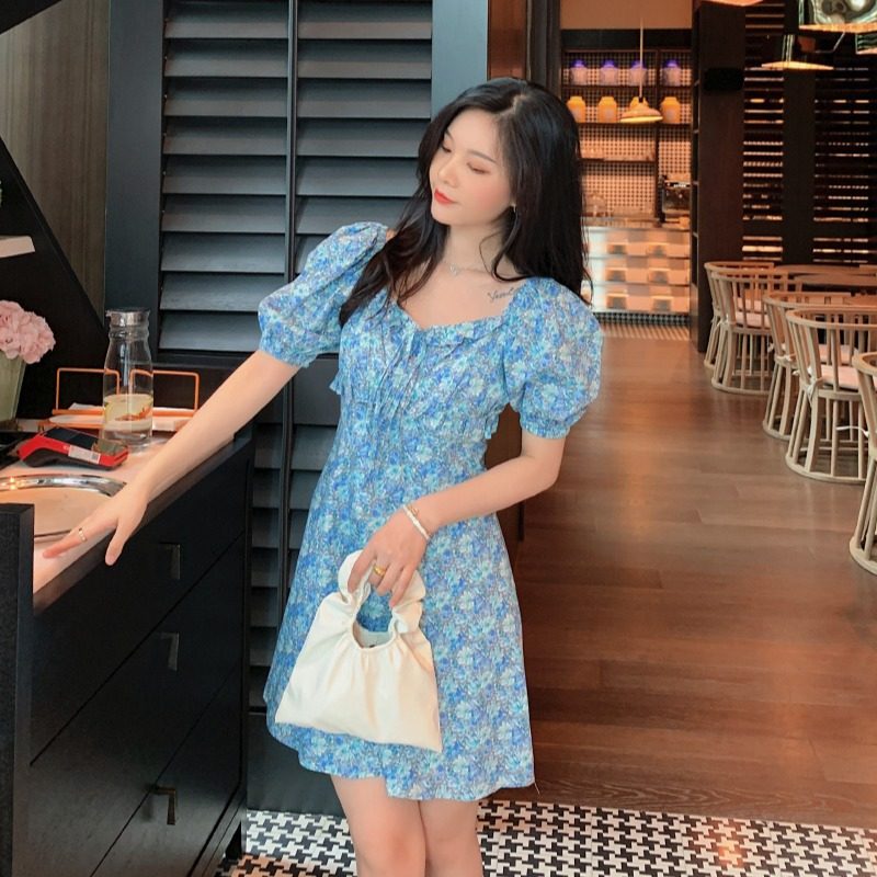 2021夏季法式泡泡袖A字裙设计感收腰显瘦碎花连衣裙女式网红同款热门设计联盟服务商