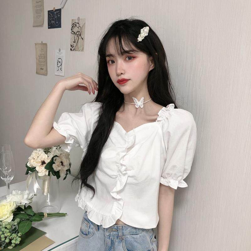 夏季韩版2021新款法式简约设计感荷叶边修身显瘦网红短袖衬衫女装热门设计联盟服务商